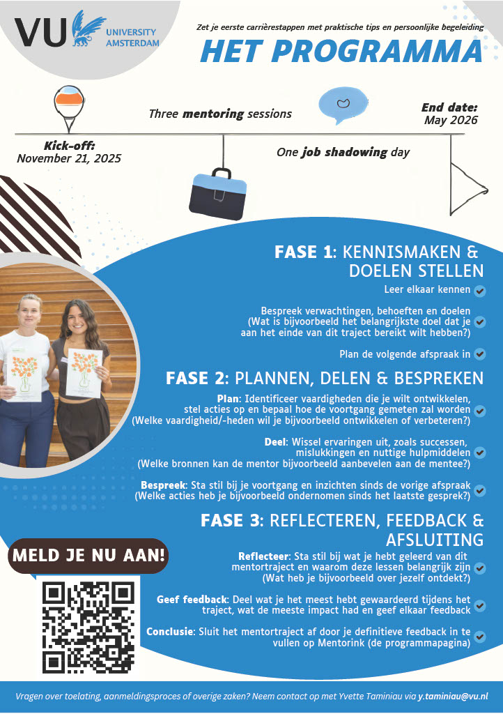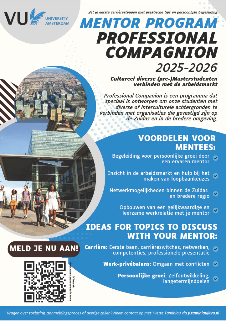 Je wordt gekoppeld aan een mentor van een organisatie die gevestigd is op de Zuid-As of in de bredere omgeving. Je plant gedurende het collegejaar drie afspraken in met jouw mentor en loopt een dag(deel) mee binnen de organisatie. De mentoren helpen je om je een betere voorstelling te maken van het werkende leven, maar adviseren ook over relevante inhoudelijke vakken en het ontwikkelen van de nodige soft- en social skills. De kick-off van het programma is op vrijdag 21 november.
